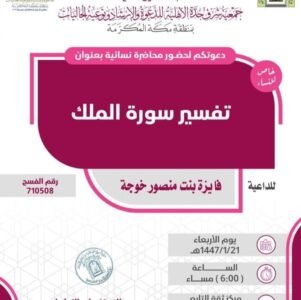 دعوتكم لحضور محاضرة نسائية بعنوان تفسير صورة الملك للداعية فايزة بنت منصور خوجة